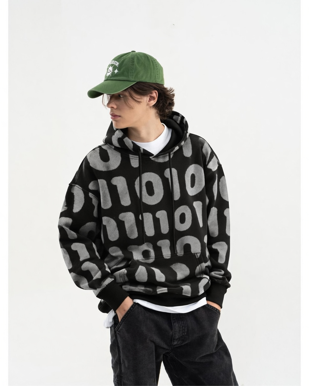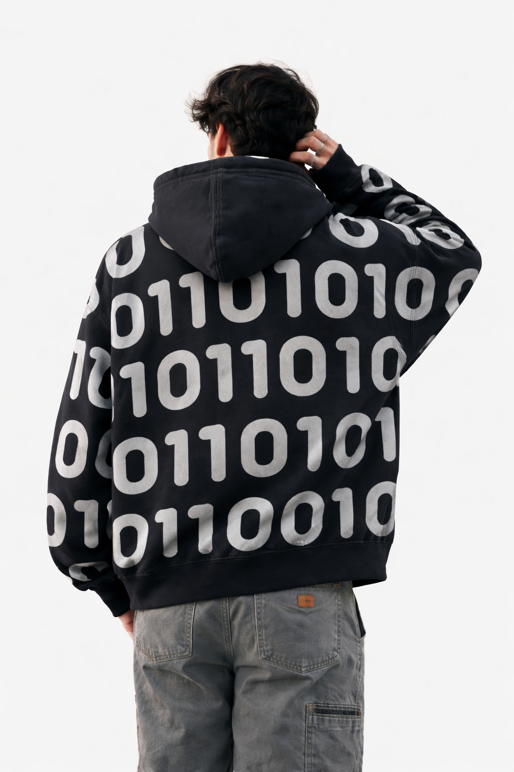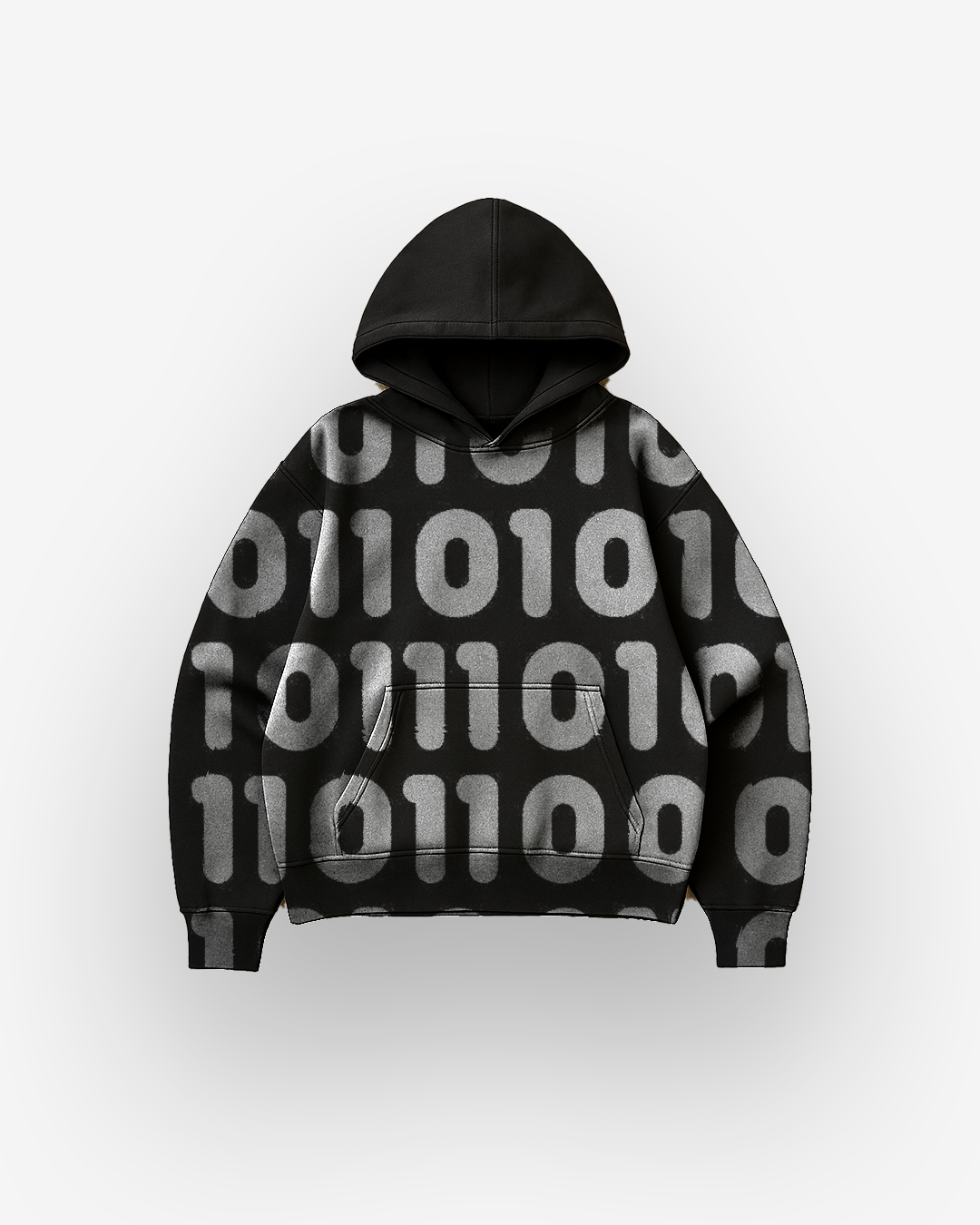 هودي أسود بتصميم أرقام ثنائية (0 و1) مستوحى من عالم البرمجة والسايبر بانك. نقش رقمي جريء يغطي الواجهة بأسلوب عصري يعكس عقلية التمرد والذكاء. مطبوع بتقنية **السيلك سكرين (Screen Print)** لضمان وضوح الأرقام وثبات الطباعة لفترة طويلة. قطعة مثالية لعشاق التكنولوجيا والستايل الغامض.